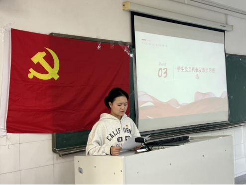 随后,姜维尚、黄宜作为学生党员代表发表了学习感悟。姜维尚认为我们要全面贯彻以人民为中心的发展思想,要把增进人民福祉、促进人的全面发展作为发展的出发点和落脚点。黄宜提到坚持人民至上是一种重要的价值观和实践精神,它不仅是一种信仰和追求,更是一种责任和担当。在学习过程中,应该始终坚持这一价值观,以实际行动践行理念,为实现中华民族伟大复兴的中国梦贡献自己的力量。