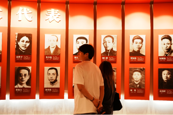 步入纪念馆,一面刻有“全中国国民革命者联合起来”的浮雕壁画映入眼帘,革命先辈振臂高呼、众志成城,为国民革命而联合奋斗,让师生们身临其境地感受到理想信仰的感召力和革命情感的感染力。过程中,讲解员生动地为大家讲解中共三大的历史背景、召开过程、重大成果与深远影响,全面生动地展现中共三大在中国共产党党史和中国革命史上的重要地位和贡献。1923年6月12日至20日,陈独秀、李大钊、毛泽东等来自全国各地及莫斯科的代表近40人出席大会。中共三大开启了第一次国共合作的大门,此后,以广州为中心,汇集全国的革命力量,一场声势浩大的反帝反封建的革命运动,如滚滚洪流一般席卷中国大地。而统一战线经过后来革命斗争的反复实践,成为中国共产党战胜强大敌人、夺取革命胜利的三大法宝之一。中共三大会址纪念馆综合采用了照片、图表、油画、文物、雕塑等多种形式展陈,采纳了全息影像等新手段,给观众带来如临历史现场的体验。进入馆内,一幅巨大浮雕呈现在队员们面前,展示了中共三大召开后,以广州为中心,全中国国民革命者联合起来形成反对帝国主义和封建军阀的革命新局面。随着同学们来到了“理想之光”展厅,看到了18位英雄的身影。在中共三大代表中,有18人牺牲在新民主主义革命时期的奋斗征程中,他们将短暂的生命定格在最灿烂的年华,用自己的生命和热血铸就共产党人的信念与忠诚,践行了共产党人的初心和使命。