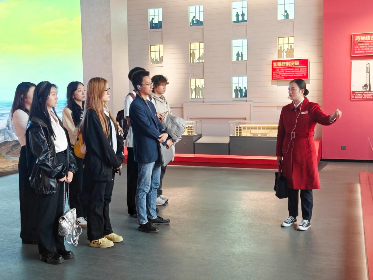 师生们首先参观了两弹城博物馆。博物馆展陈内容以“两弹”发展历程为主线,分为序厅篇章、时代决策、铸就辉煌、峥嵘岁月、融合发展、科技兴市6个板块。大家在详实的历史图片、珍贵的文物实体和生动的视频影像资料前驻足聆听讲解,全面了解中国原子弹、氢弹的研制背景与过程,深刻感受科研工作者在艰难条件下自强、在艰苦奋斗中前进的精神品质。
