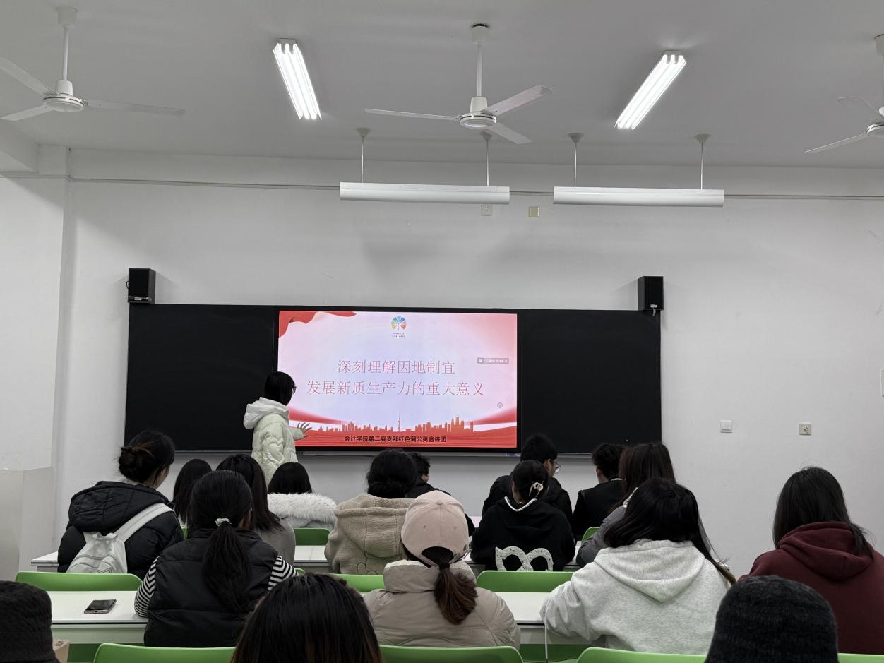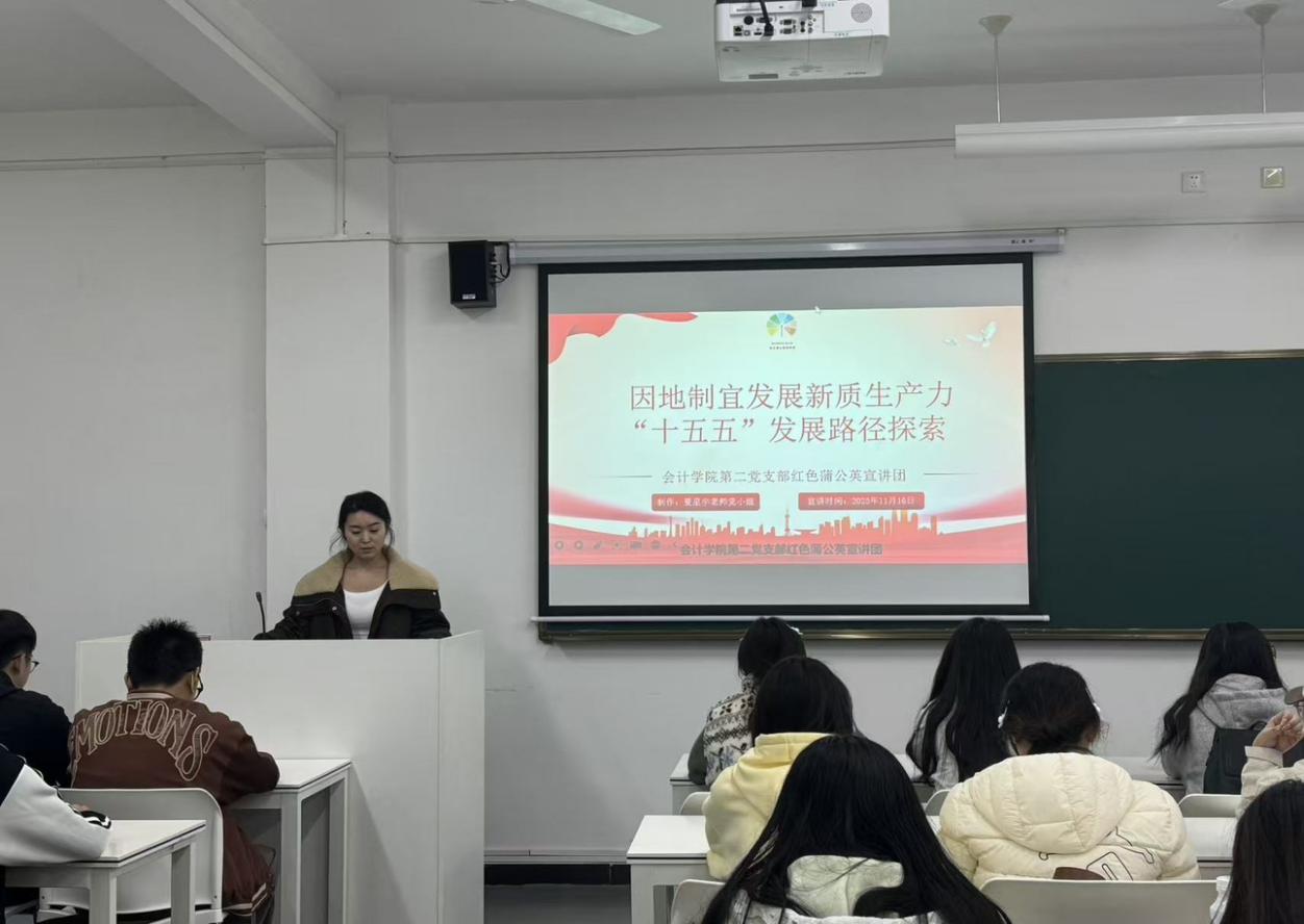 新质引领把航向,因地制宜启新程。11月16日,西南财经大学天府学院会计学院第二党支部学生党建办公室红色蒲公英宣讲团,在各班晚签到班会组织开展以“因地制宜发展新质生产力‘十五五’发展路径探索”为主题的宣讲活动。