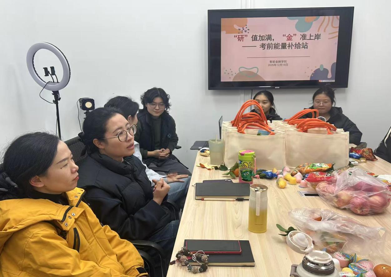 为给考研学子提供精准支持、缓解备考压力,12月15日,智能金融学院在成都校区(西区)28栋1楼举办了“‘研’值加满,‘金’准上岸——考前能量补给站”主题座谈会。学院分党委副书记刘秀、罗婷,第二党支部书记王怡静及辅导员骆佳与考研学子面对面交流,为大家注入冲刺能量。