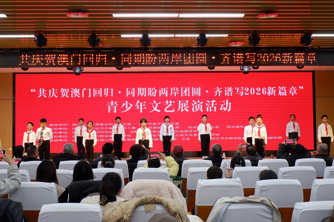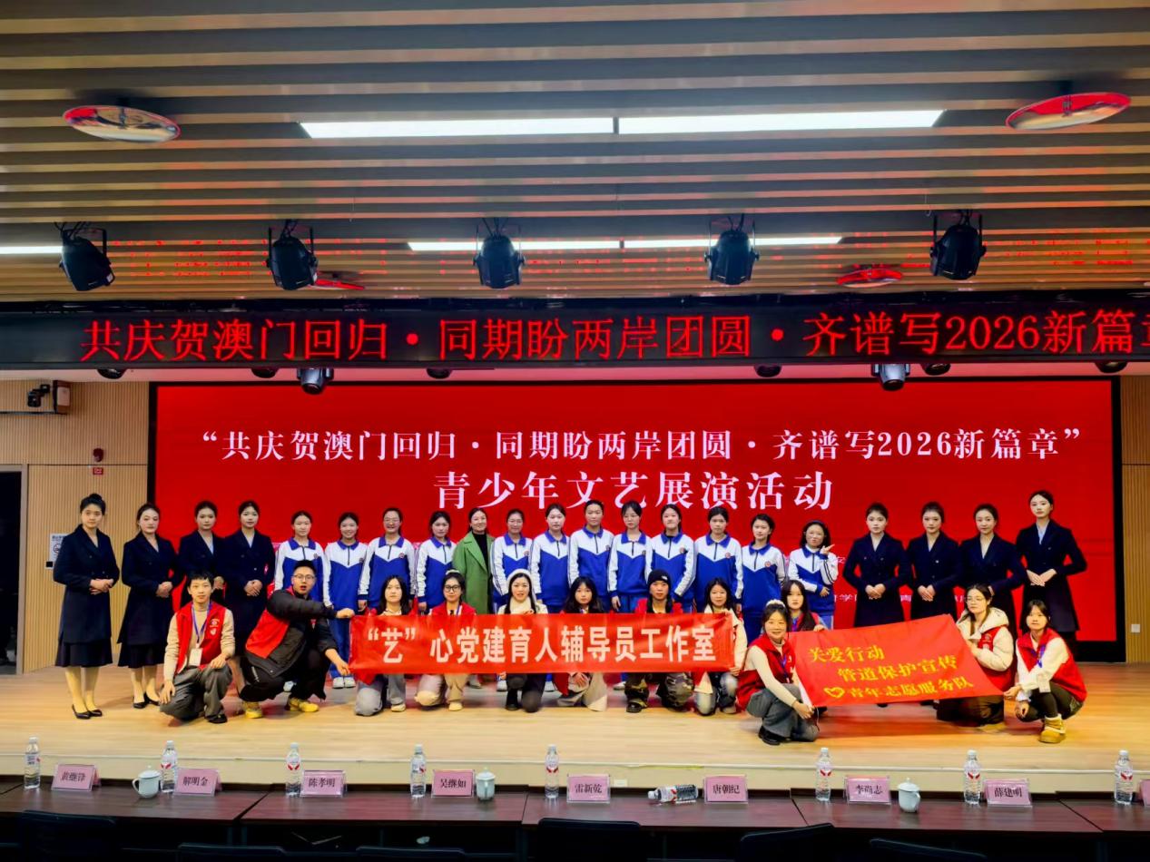 为深入贯彻《新时代爱国主义教育实施纲要》相关要求,推动社区志愿服务与青少年思想道德建设深度融合,12月20日澳门回归祖国26周年之际,艺术与传媒学院学生第一党支部联合“艺”心党建辅导员工作室、盈见青心志愿服务团,走进成都市金牛区妇幼保健院学术厅,助力开展“共庆贺澳门回归·同期盼两岸团圆·齐谱写2026新篇章”青少年文艺展演。本次活动由多方关工委指导、社区联合主办,以艺术为媒、服务为桥,生动践行爱国主义教育,为社区共建凝聚青春力量。
