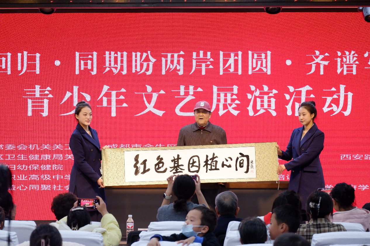活动现场,青少年们以古筝独奏、诗歌朗诵、合唱等艺术形式依次登台亮相,呈现了一场精彩的文化表演,将家国情怀、统一期盼等核心主旨转化为直观可感的文化表达,让爱国主义教育在艺术实践中自然浸润。原四川省关工委副主任雷新乾现场挥毫写下“红色基因植心间”的墨宝,这既是社区志愿者对青少年的殷切期许,更是社区共建中“传帮带” 精神的生动诠释。