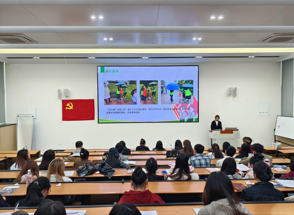 在“铸魂”环节,学生代表曾钰尭立足群众需求,分享了以志愿服务践行雷锋精神的实践经历。她主动投身社区环境整治,清理楼道杂物、擦拭公共设施、规整停放车辆,以点滴行动改善社区环境。同时,结合“河小青”护河行动,同步开展政策咨询、便民服务等志愿活动,将雷锋精神转化为便民利民的实际行动,传递温暖与力量。