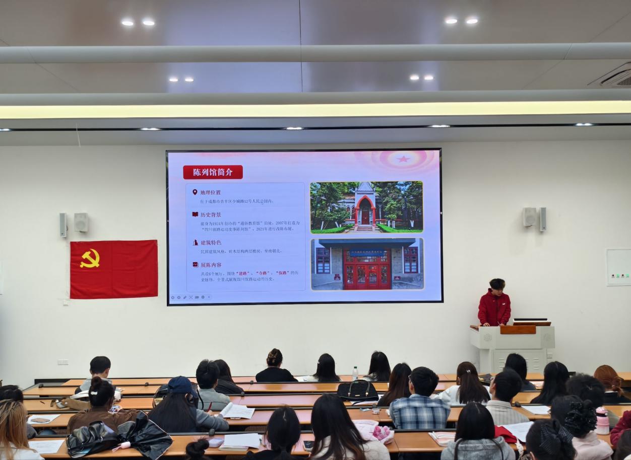 在“寻根”环节,学生代表刘家良聚焦四川保路运动这一重要红色资源,分享了在辛亥秋保路死事纪念碑、四川保路运动史事陈列馆的研学感悟。他怀着崇敬之心,聆听历史讲解、研读史料记载,深刻体会四川人民捍卫国家路权、反抗封建压迫与帝国主义侵略的英勇抗争精神,让红色历史从书本走向现实,革命精神入脑入心。