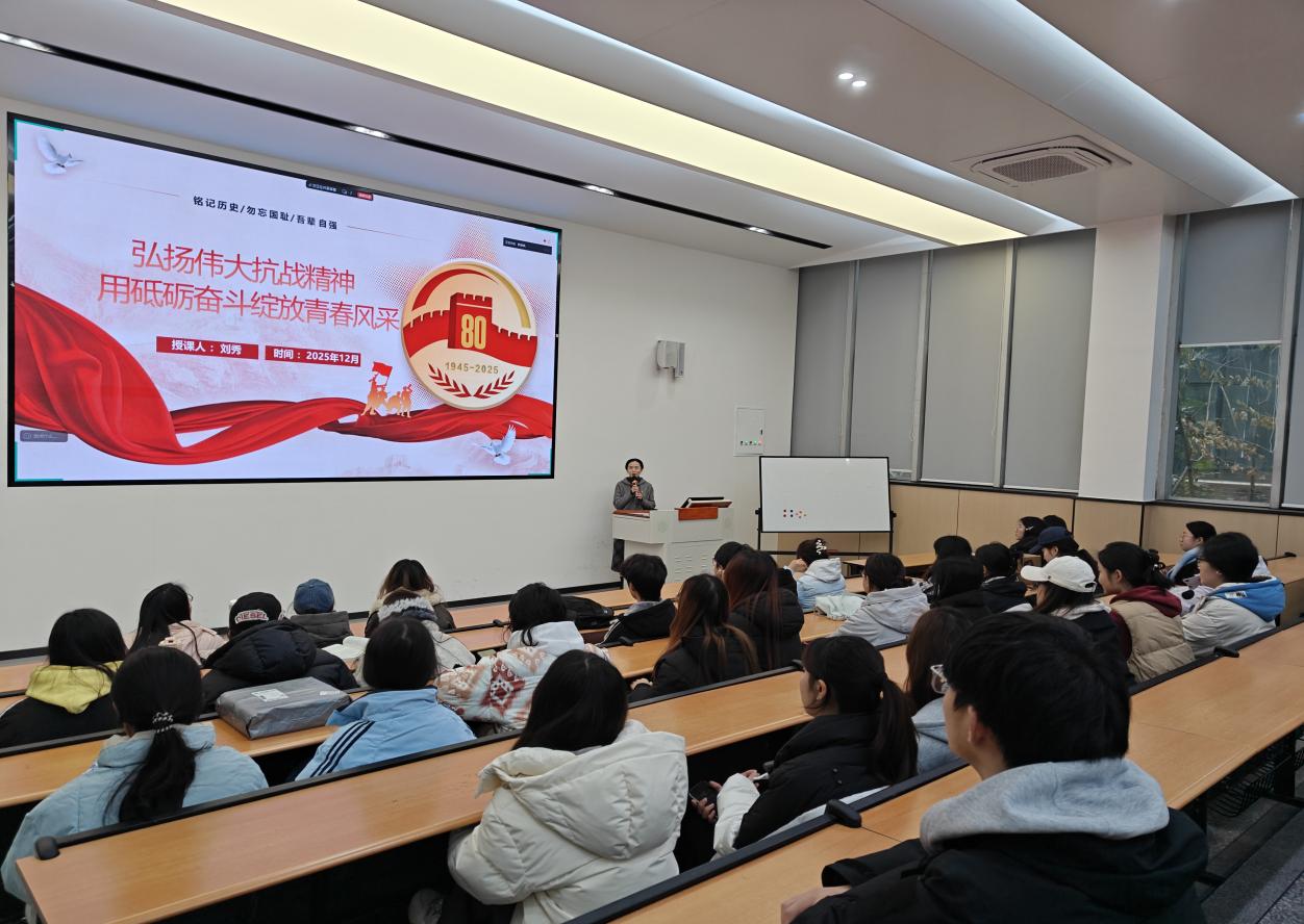 刘秀首先阐述了以“天下兴亡、匹夫有责的爱国情怀,视死如归、宁死不屈的民族气节,不畏强暴、血战到底的英雄气概,百折不挠、坚忍不拔的必胜信念”为核心的伟大抗战精神。随后,她聚焦青年视角,结合青年学子投笔从戎等鲜活史实,从“家国担当”“坚韧不拔”“创新破局”三个维度,生动诠释了伟大抗战精神的时代价值。通过展示抗战时期金融先辈建立地下金融通道支援前线的史料,她将厚重历史与专业特色贯通,指出新时代金融学子的使命在于将爱国情怀融入专业学习,以金融科技本领服务国家发展,在新时代新征程上不懈奋斗、贡献智慧。