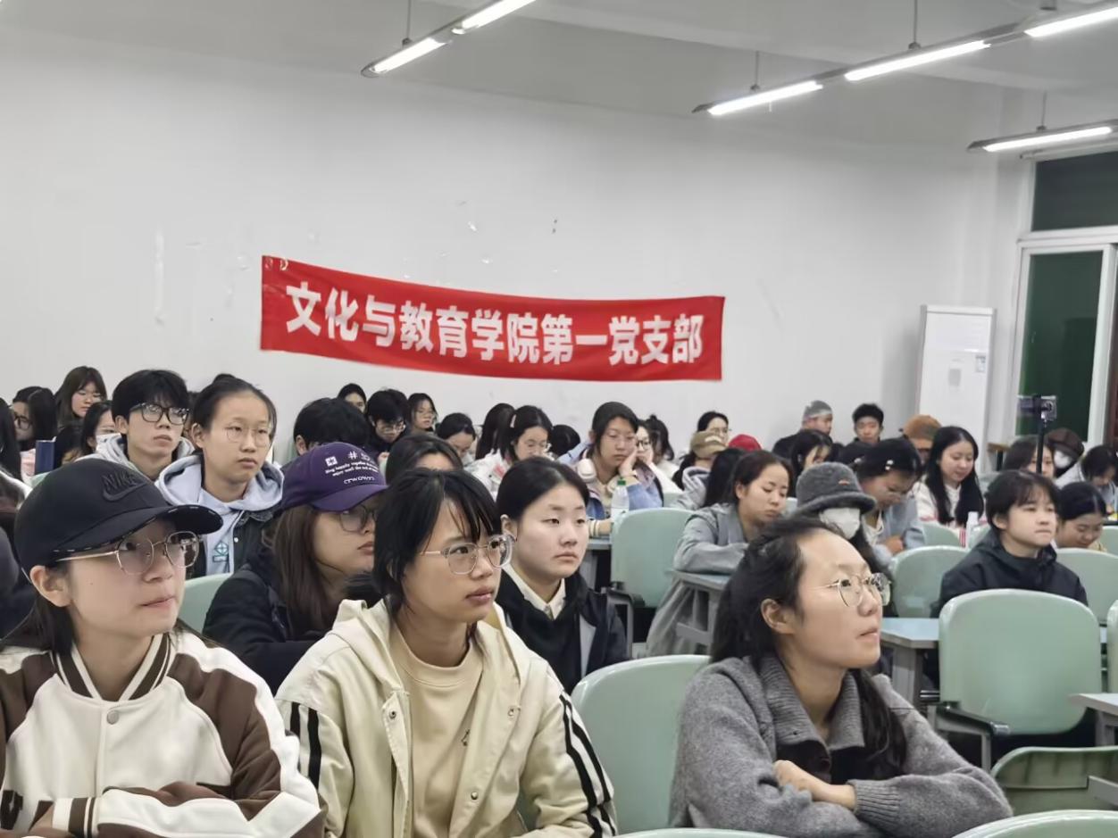 为增强学院青年对伟大抗战精神的感悟,从历史中汲取奋进力量,增强党性修养,文化与教育学院第一党支部于10月21日晚在二教2305教室开展了以“传承弘扬伟大抗战精神——学习习近平总书记在纪念中国人民抗日战争暨世界反法西斯战争胜利80周年大会上的重要讲话精神”为主题的十月主题党课。本次党课由钟思思主持,文化与教育学院第一党支部组织委员邓嘉婷主讲,文化与教育学院第一党支部全体党员、积极分子和入党申请人共同参与。