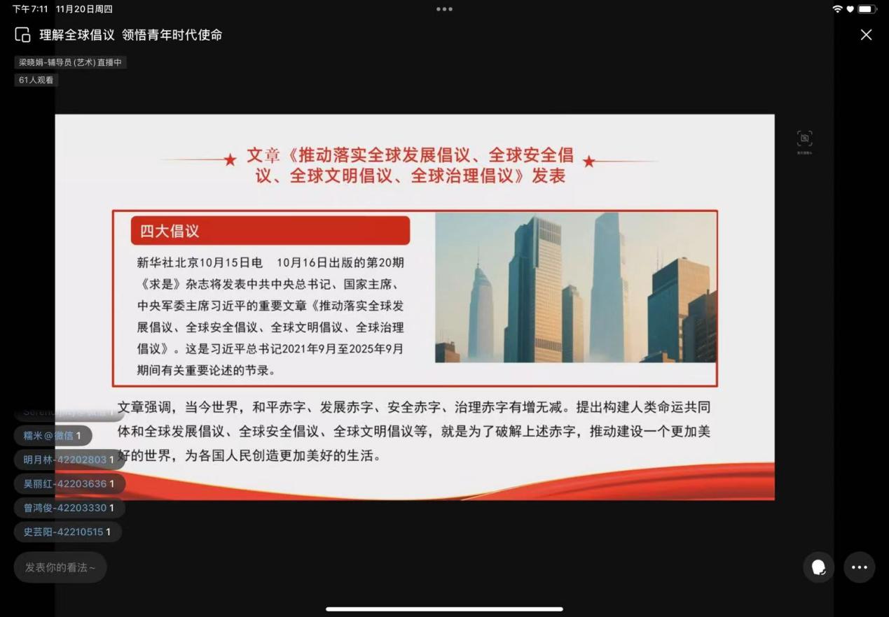此次党课深入阐释了四大全球倡议的内涵及其实践路径,使青年更加深刻地认识到,四大全球倡议不仅是中国为全球治理贡献的智慧与方案,更是当代青年成长发展的坐标与行动指南。参与学习的党员和入党积极分子纷纷表示,将把个人发展融入国家与全球治理的大局之中,凭借专业能力和责任担当,积极投身于全球倡议的实践,以实际行动展现青春风采,贡献青春力量。