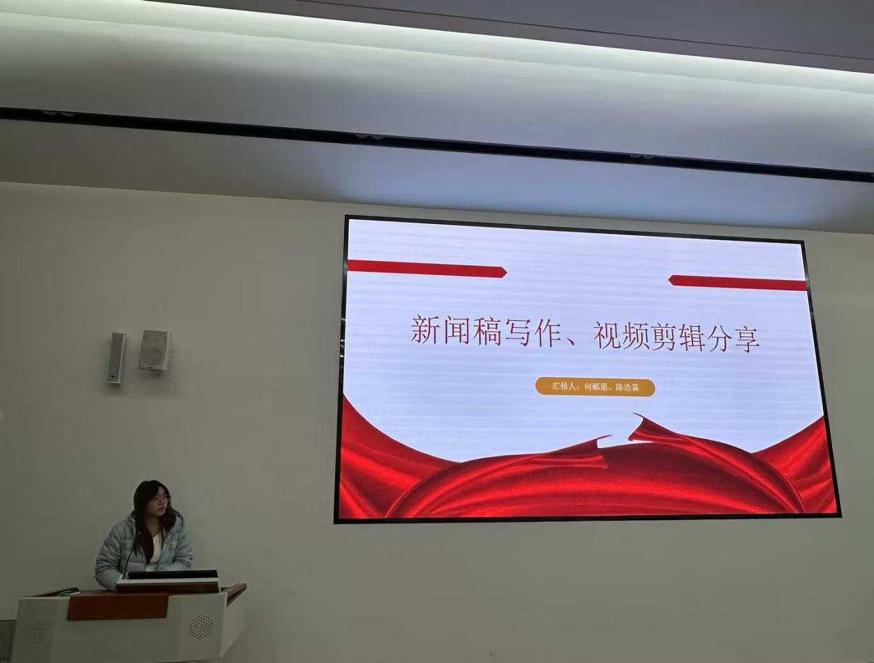 在专题分享环节,何郦愿聚焦新闻稿写作进行了系统讲解。她从新闻稿的核心原则、内容要求、格式规范与质量标准等维度展开,重点强调了新闻稿写作需坚持正确政治方向、严守宣传纪律,做到内容真实、风格庄重、版权合规,并结合常见案例,提醒大家注意规避时政表述、文字及格式上的常见错误。随后,陈浩霖就视频拍摄与剪辑技巧作分享。他从拍摄选题与机位设置讲起,介绍了学院核心工作、师生风采、科普趣味等多元选题方向,并详细讲解了不同场景的拍摄技法,以及素材筛选、剪辑排版、音效字幕等后期制作核心要点,为同学们提供了专业且实用的创作指南。