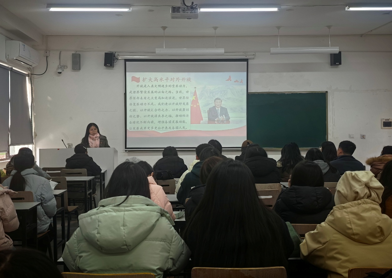 会议伊始,全体成员庄重肃立,齐声奏唱国歌。随后,李金玲同志作围绕“中国式现代化建设的推进路径与实践探索”“以人民为中心,持续提高人民生活品质”“锚定目标任务,全面推进美丽中国建设”以及“把握时代脉搏,开创中国特色大国外交新局面”等关键议题,系统学习了《习近平谈治国理政》第五卷的核心要义。从全面深化改革的系统部署,到高质量发展的实践要求;从全过程人民民主的制度优势,到人类命运共同体的世界视野——通过集中学习与深入交流,全体同志进一步深化了对习近平新时代中国特色社会主义思想丰富内涵和实践路径的理解。李金玲同志还结合学院专业特色,分析了青年学子在服务国家战略、践行初心使命中的具体定位与努力方向,激励大家将学习成果转化为推动工作的实际行动。