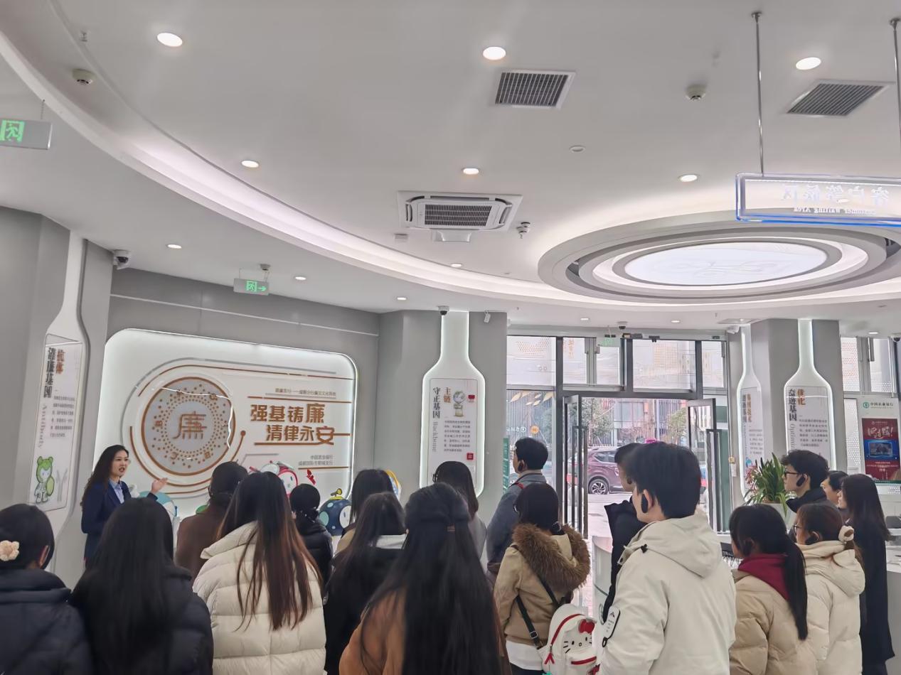 在农行成都国际生物城支行工作人员的引导下,师生们有序参观了清廉金融基地的核心展区,重点学习支行打造清廉金融基地的思路理念、建设路径与实践成果,以及将清廉理念融入日常运营、客户服务、团队建设的具体举措,系统梳理了清廉金融的核心内涵。互动展示区通过廉洁文化标语、清廉承诺墙、金融廉洁文化作品等多元形式,让清廉金融概念直观可感。工作人员的细致讲解,让师生们对“让清廉金融入脑入心”有了深刻认知。
