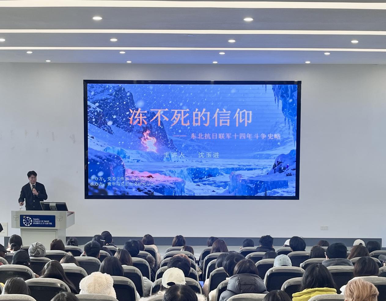 为深入学习贯彻习近平新时代中国特色社会主义思想和党的二十届四中全会精神,强化青年学生思想政治引领,传承红色基因,艺术与传媒学院学生第一党支部于1月6日下午在德阳校区B301报告厅组织开展了党史学习教育专题讲座。本次讲座特邀马克思主义学院沈玉进担任主讲人,以《冻不死的信仰——东北抗日联军十四年斗争史略》为题展开全面深入的讲解,为现场师生带来了一堂兼具历史厚度与精神感染力的思政教育课。