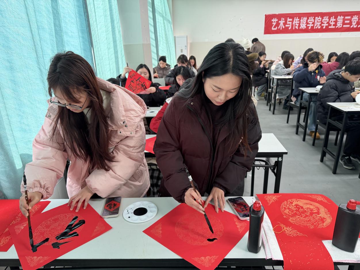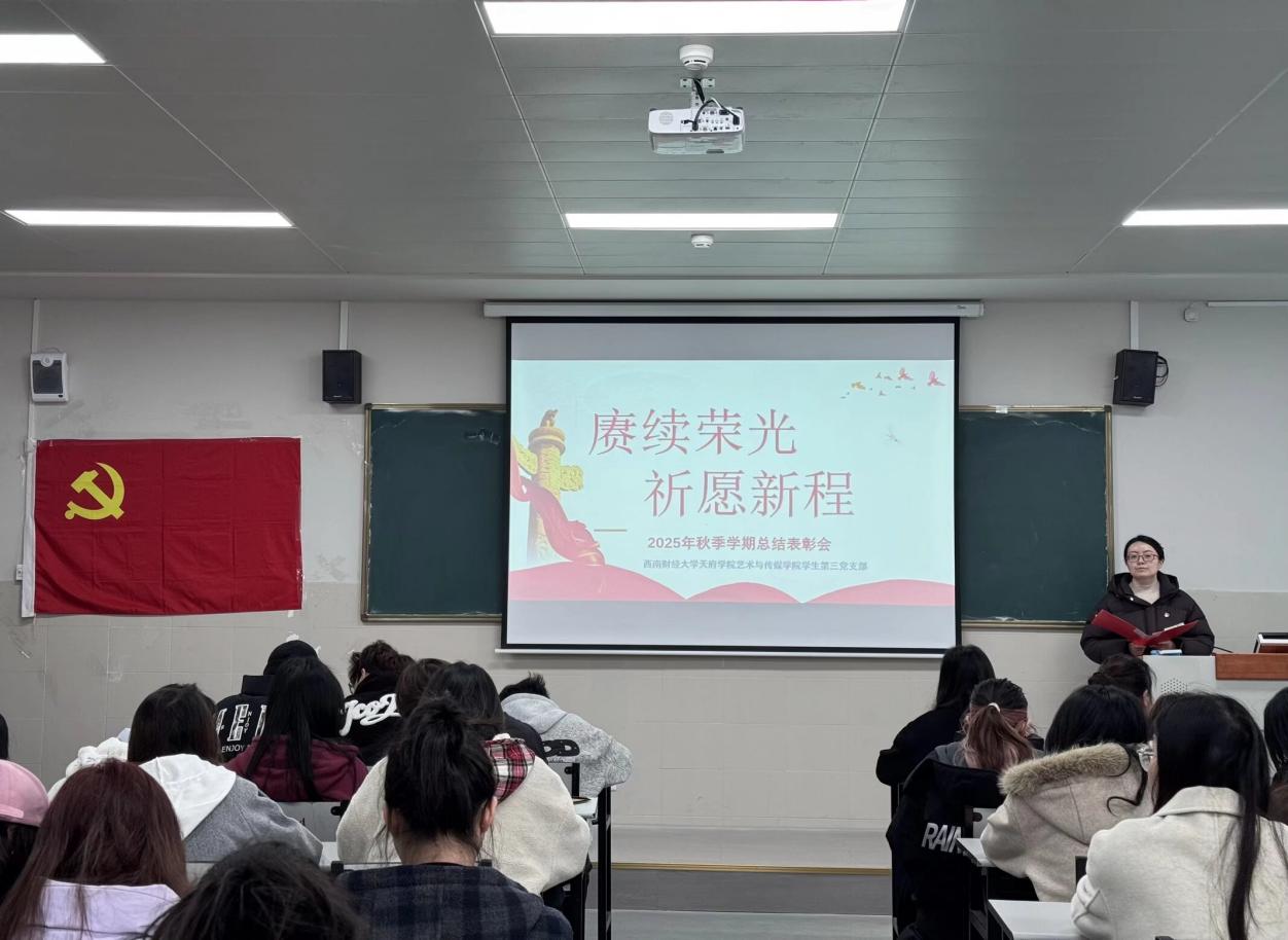为全面总结2025年秋季学期党支部工作成效,表彰先进典型,凝聚奋进力量,同时传承中华优秀传统文化,1月7日,艺术与传媒学院学生第三党支部于成都校区(东区)L5-345教室组织开展了以“赓续荣光,祈愿新程”为主题的期末表彰会暨新年祈福活动。支部全体党员教师及入党积极分子参加了本次活动。
