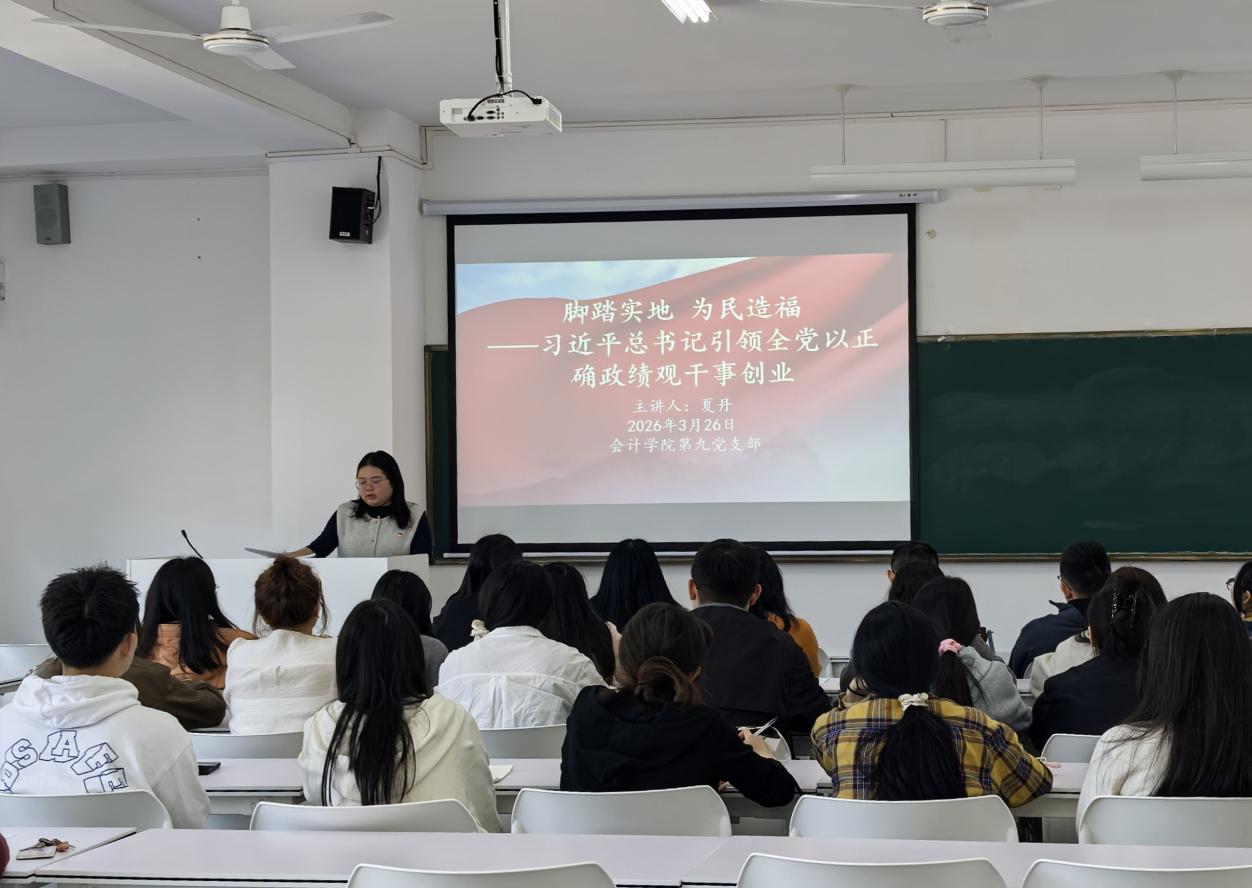 为深入学习贯彻习近平总书记关于树立和践行正确政绩观的重要论述,教育引导支部师生树立正确政绩观,以实干担当推动事业发展,2026年3月26日,会计学院第九党支部组织开展“脚踏实地,为民造福——习近平总书记引领全党以正确政绩观干事创业”专题党课,第九党支部全体党员及入党积极分子参与本次学习。