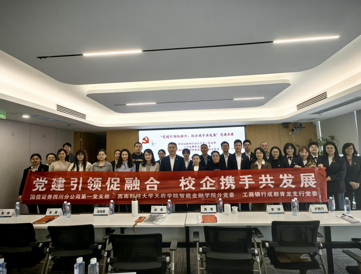 为深化党建引领,推进校企、银证多方协同育人与党建融合发展,4月7日,西南财经大学天府学院智能金融学院分党委与国信证券四川分公司党总支、工商银行成都青龙支行党委,在国信证券成都二环路营业部开展“党建引领促融合,校企携手共发展”党建共建学习交流活动。学院分党委副书记刘秀、罗婷,副院长陈娴及党员师生代表出席此次活动。