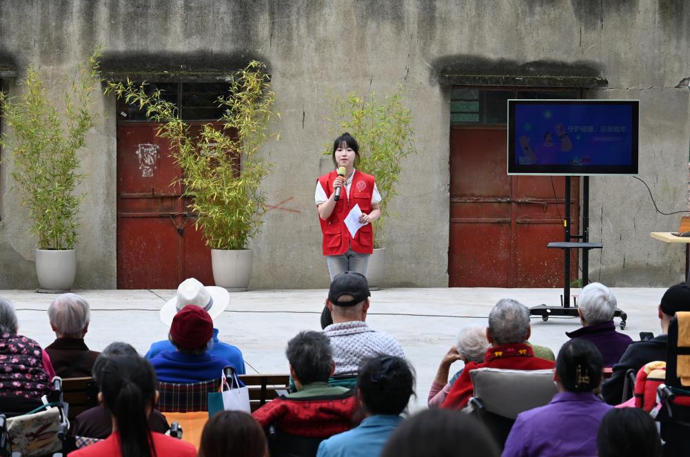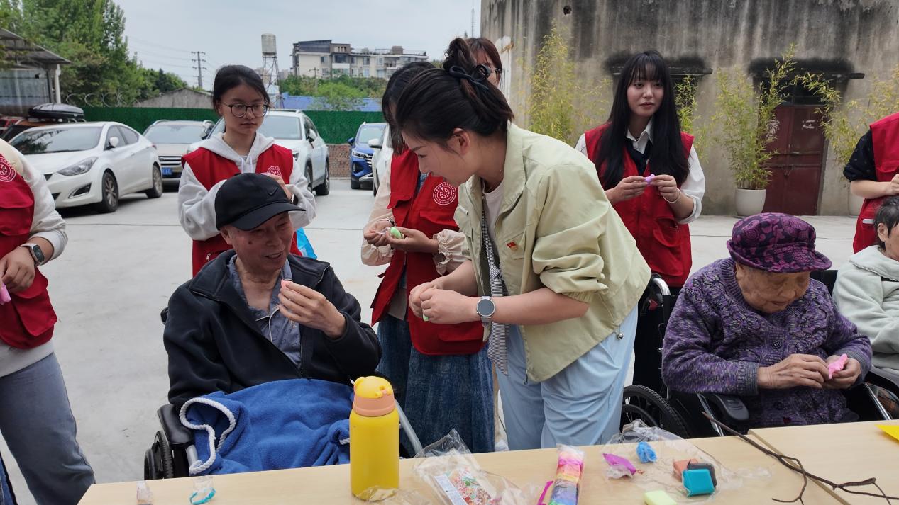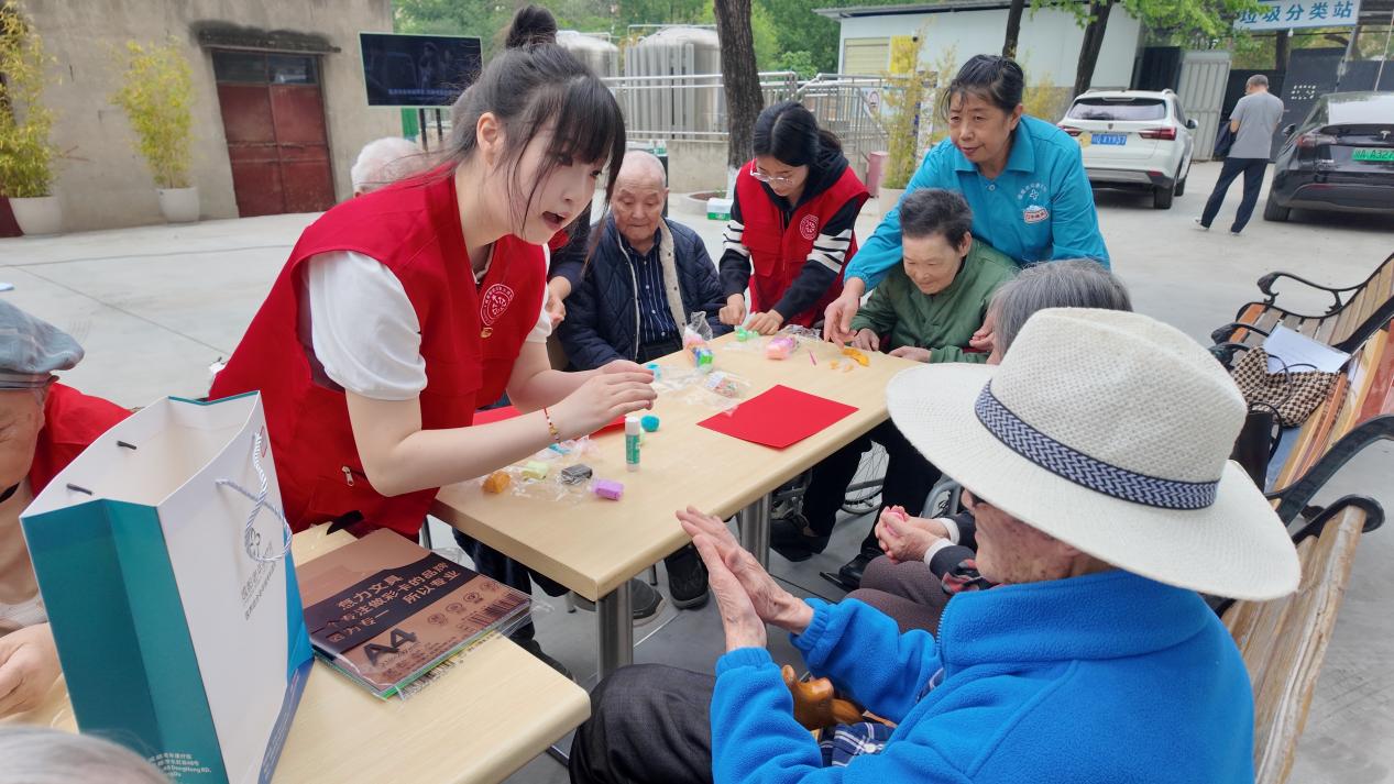 活动紧扣老年人健康需求,首先由学院宣讲团志愿者梅嘉艺围绕常见老年传染病预防与日常保健进行知识宣讲,用通俗易懂的语言讲解传染病防护要点和科学用药常识,帮助老人提升健康自护能力。随后,学院艺术团的卢舒畅同学演唱了歌曲《外婆的澎湖湾》,并带动老人一同唱起红歌,现场气氛温馨热烈。第四党支部入党积极分子还献上手势舞《陪你长大》,用肢体语言传递陪伴与敬意。在剪纸、超轻黏土手工环节,志愿者与老人共同创作,现场笑声不断。